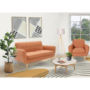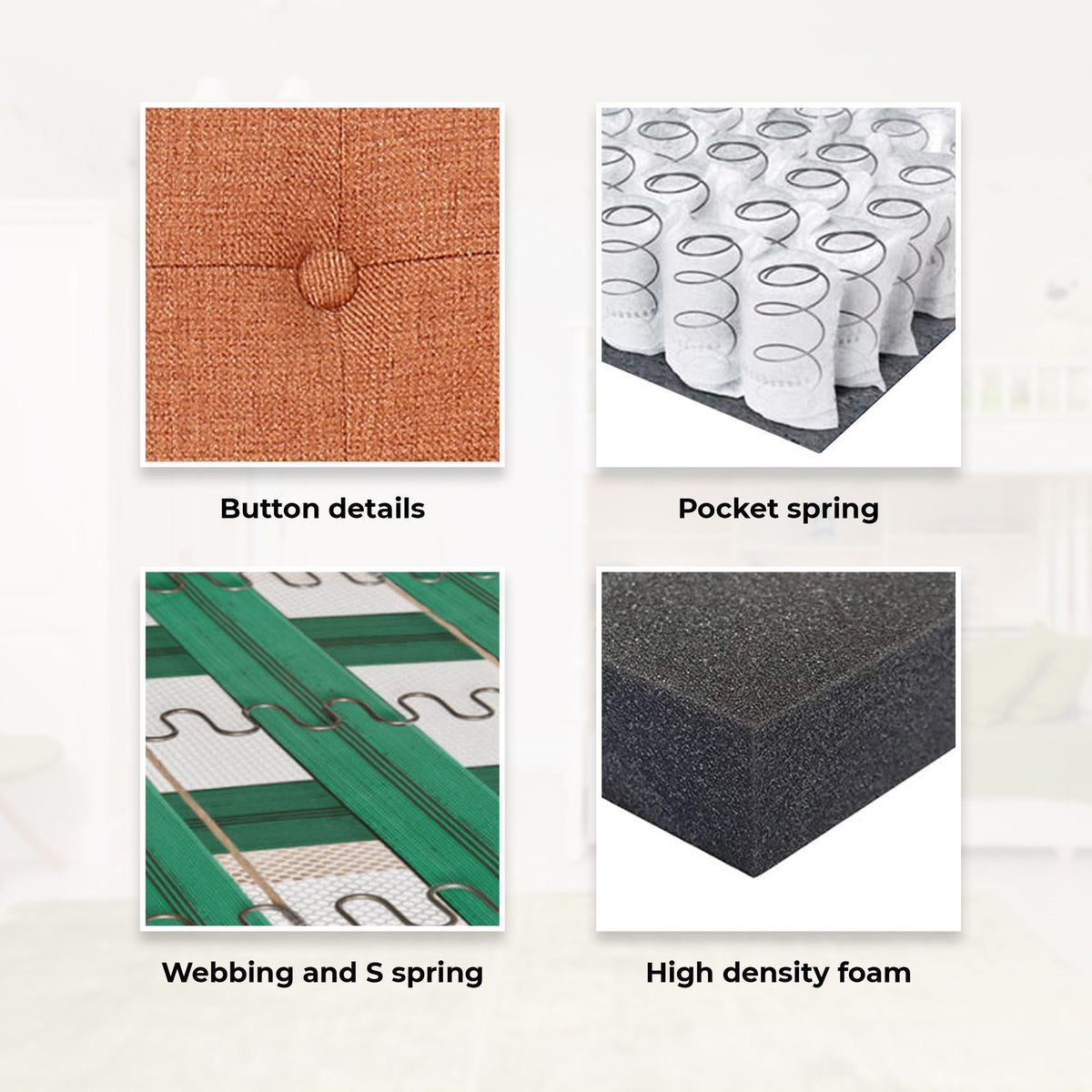 A sofa is the focal point of a living room. Place this beautiful sofa set that consists of a 1-piece 3-seater sofa and a 1-piece 2-seater sofa, designed in the Scandinavian style, in your living room to fill it with elegance. This sofa set is an epitome of superb craftsmanship. They showcase comfy looks, featuring tapered legs and outwardly sloping arms. They have a fixed backrest with button details and loose-style seat cushions with high-density foam for superior comfort. The sofas in burnt orange colour mix easily with any interior decor style. The entire sofa is upholstered in 100% polyester fabric, which is soft and durable. The stunning sofas also feature high-density foam, webbing, pocket springs, and S-springs that ensure complete relaxation for the body. The structural frame of the sofa is made of sustainably harvested solid wood and plywood, which gives it internal strength and resilience. The frame has a five-year warranty; the foam and springs have a three-year warranty; the fabric and stitching have a one-year warranty; and all other parts have a one-year warranty.