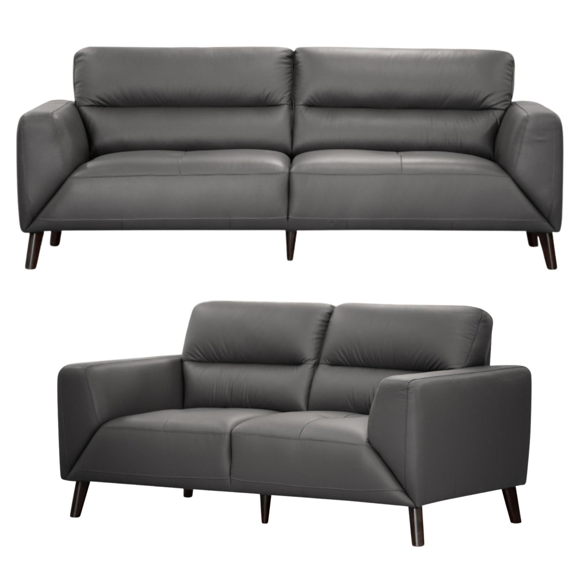 A luxurious lounge set that displays one of the best furniture arts. Place this beautiful sofa set, designed in a modern style, in your living area and see it become the most lovable corner of the house. The adorable set of 3-seater and 2-seater lounges features quilted seat details with super comfy lumbar support. The S-springs, webbing, and dense foam make the seats worth it. You can feel it when you sit or stretch your body on the lounge. The lounges have thick cushioning for added comfort, and they are upholstered in a 100% leather cover in gunmetal colour. The colour blends easily with any home interior theme or living space design. The stunning sofas also feature strong, timber legs. The structural frame of the lounge is made of sustainably harvested solid timber and plywood, giving it solid internal strength and making it durable. The frame has a five-year warranty; the foam and springs have a three-year warranty; the leather and stitching have a one-year warranty; and all other parts have a one-year warranty.